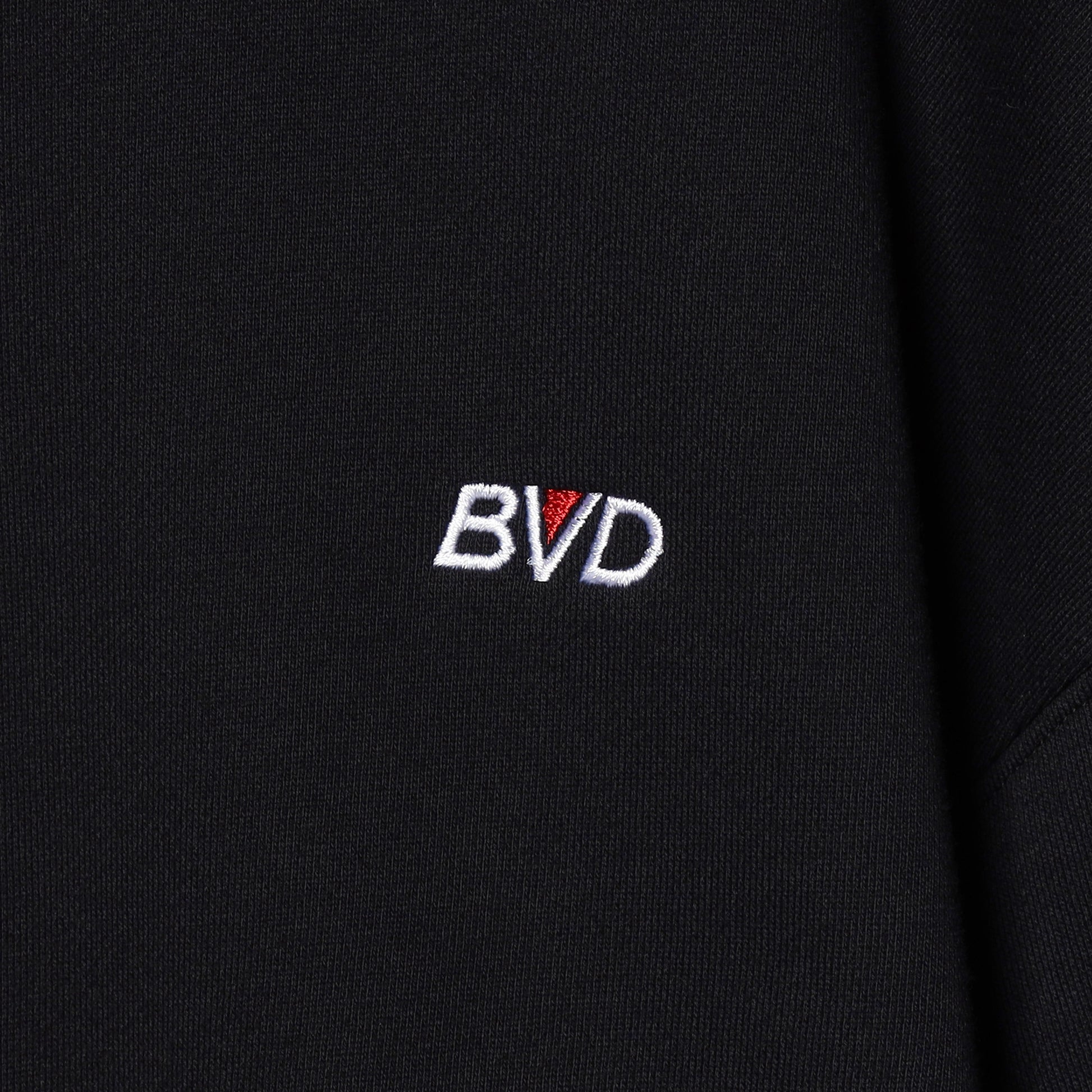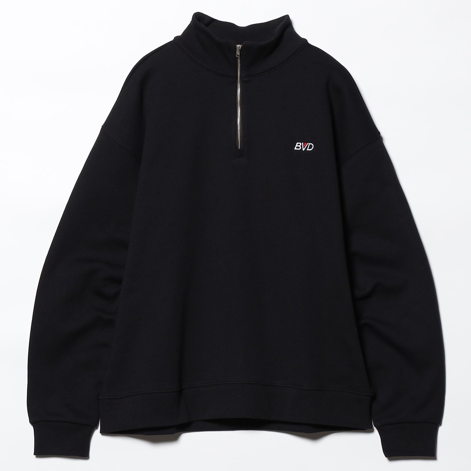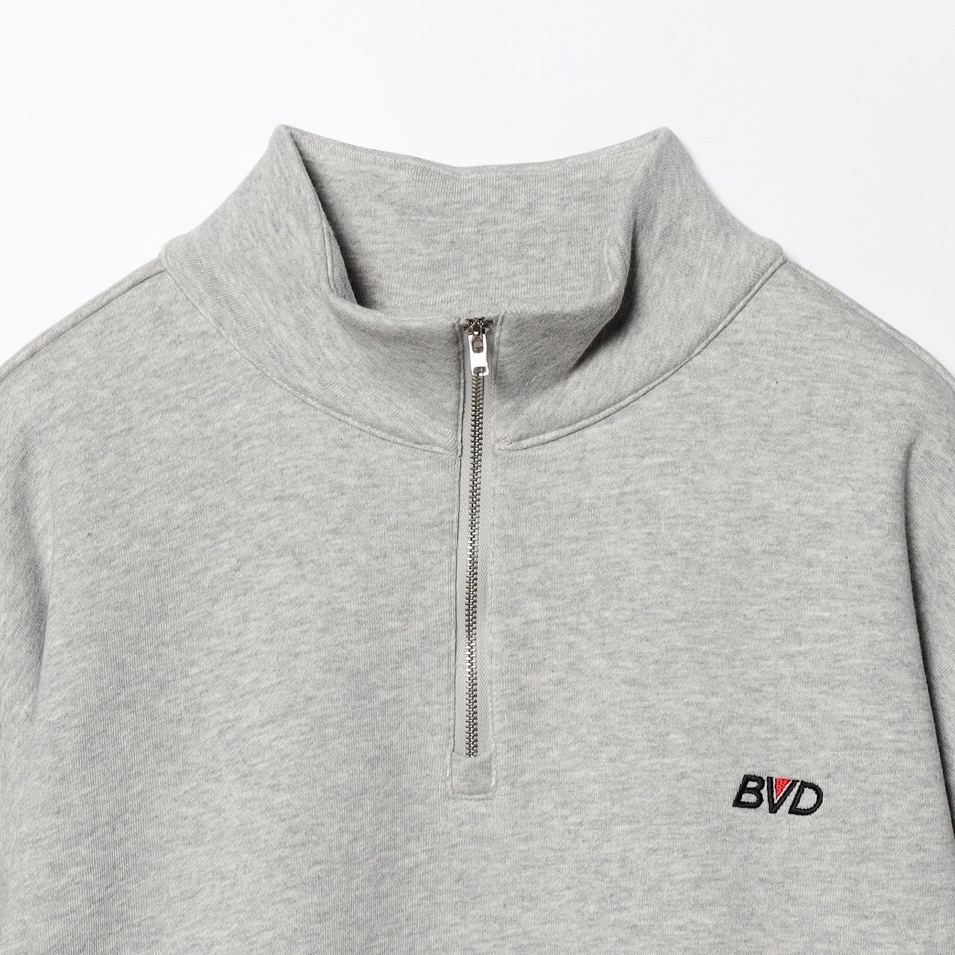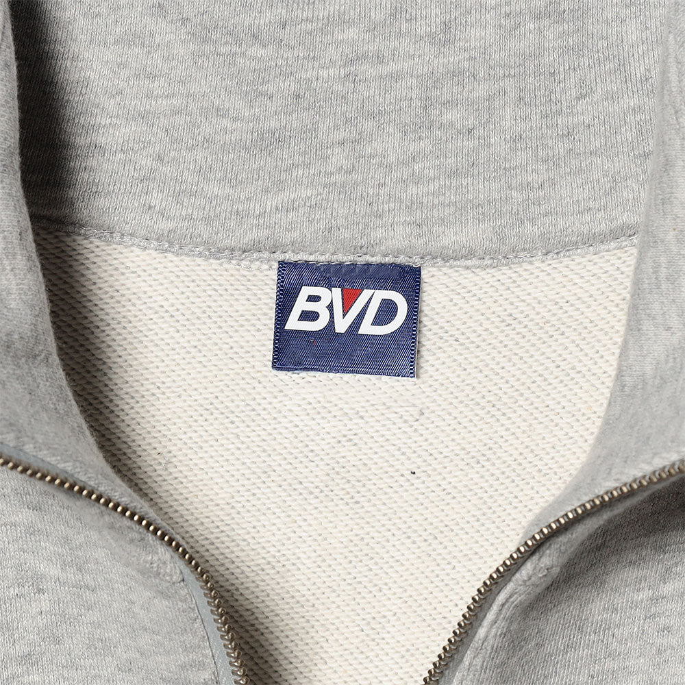 クルースウェット、フーディに次いでもはやアメリカンスタンダードなハーフジップスタイルに、左胸には、当ブランドが1970年代~90年代まで使用したオールドロゴが刺繍で表現されたB.V.D.ベーシックな一枚。